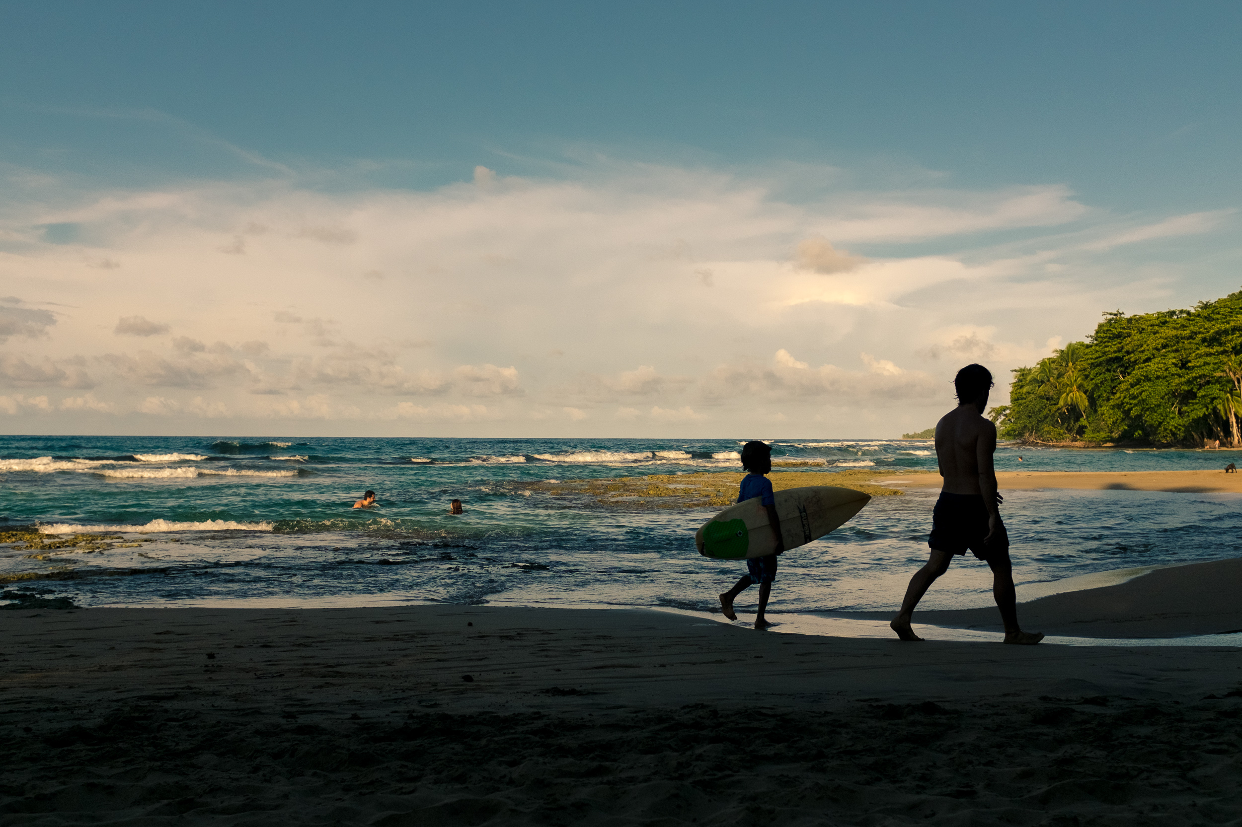 The sun sets in the west, so on the Caribbean side of Costa Rica, that means that there are no magic sunsets over the water. The tall trees and palms of the rainforest cast a shadow over the evening beach, while the sun continues to shine on the water. Locals surf and play in the warm Caribbean water, then rest on the beach in the shade.